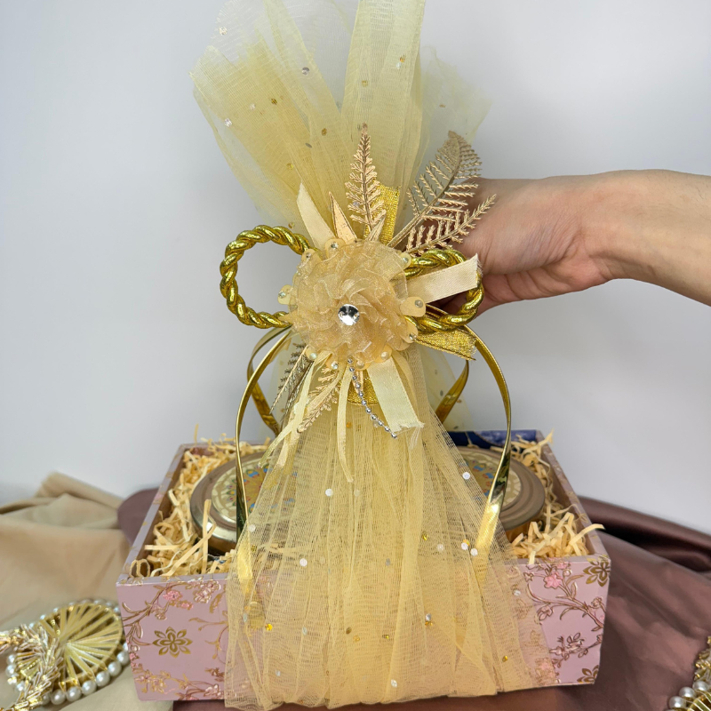 Celebrate special moments with our Luxury Golden Gift Hamper, beautifully wrapped in an elegant golden net fabric and finished with a decorative floral bow. Perfect for weddings, festivals, anniversaries, and corporate gifting, this hamper is designed to leave a lasting impression.